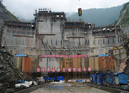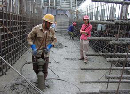 C60高標(biāo)號混凝土,其粗骨料粒徑30mm以下,級配合理;砂率39%,中細(xì)砂;以及水泥用量均能達(dá)到泵送要求。但受強(qiáng)度的制約,其水灰比在O.2-0.3之間,致使坍落度為12cm左右,影響混凝土泵送時的流動性,增大了阻力。增加砂率能提高其可泵性,但影響了強(qiáng)度,達(dá)不到設(shè)計施工要求。因此,解決這一問題的唯一途徑就是加減水劑,既不影響強(qiáng)度,又可增大坍落度。開始泵送時未加減水劑,泵送壓力為26-28MPa,泵送速度慢、效果差。如果長時間高壓輸送,會影響混凝土泵的穩(wěn)定性和可靠性。后來摻入一定量的減水劑(NF-2),坍落度達(dá)到18-20m,泵送壓力明顯下降,僅為18MPa左右,使泵送工效提高約一倍。另外,在泵送過程中,還應(yīng)提醒操作人員:料斗內(nèi)的混凝土務(wù)必在攪拌軸中線以上,否則會導(dǎo)致吸空造成混凝土四處飛濺傷人,或由于吸空、氣體壓縮而造成堵管。