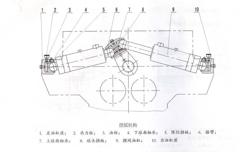 搖擺機構(gòu)的結(jié)構(gòu)如下圖4所示:它主要由左油缸座1,承力板2,油桿3,下球面軸承4,限位擋板5,搖臂6,上球面軸承7,球頭擋板8,擺閥油缸9,右游缸座10等零部件組成。搖擺機構(gòu)中擺閥油缸通過液壓系統(tǒng)的控制,保證主油缸的順序動作,驅(qū)動搖臂,從而帶動S管,使S管與主油缸協(xié)調(diào)工作。保證S管的切割環(huán)口與泵送的輸送缸為準。