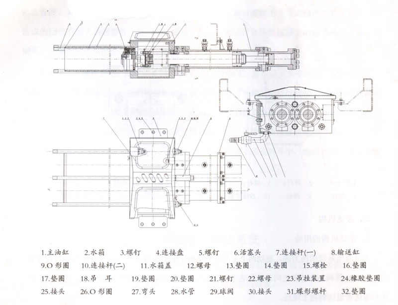泵送機構(gòu)的結(jié)構(gòu)如下圖3所示:主要由主油缸,水箱,連接盤,活塞頭,連接桿(一),輸送缸,連接桿(二),水箱蓋,吊耳,吊掛裝置,橡膠墊片,接頭,彎頭,水管,球閥,蝶形螺桿等零部件組成。