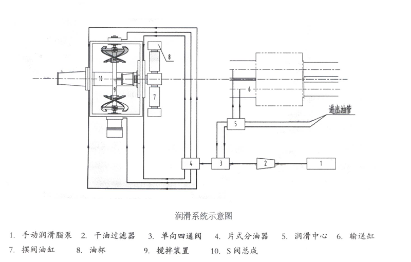 潤滑系統(tǒng)由手動潤滑脂泵、干油過濾器、單向四通閥、片式分油器、潤滑中心和管道組成,如上圖所示。