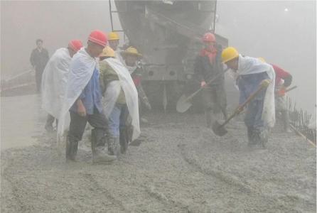 3、當(dāng)砼澆筑時(shí)突降中大暴雨但其持續(xù)時(shí)間較短(2小時(shí)左右),則應(yīng)將已入模的砼立即予以覆蓋并改為間斷地用砼進(jìn)行覆蓋澆筑處理,砼澆筑間隔時(shí)間應(yīng)小于砼的初凝時(shí)間,以避免該處出現(xiàn)施工冷縫。雨停后及時(shí)清除積水并重新恢復(fù)砼正常澆筑施工。