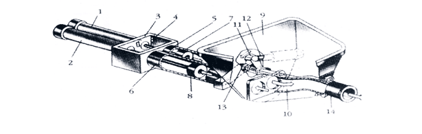 (1)(2)主油缸;(3)水箱;(4)換向裝置;(5)(6)混凝土缸;(7)(8)混凝土活塞;(9)料斗;(10)分配閥;(11)擺臂;(12)(13)擺動油缸;(14)出料口 小型混凝土輸送泵的活塞是與主油缸的活塞桿連接,在主油缸液壓油作用下,作往復運動時,一缸前進,則另一缸后退;混凝土缸出口與料斗連通,分配閥一端接出料口,另一端通過花鍵軸與擺臂聯(lián)接,在擺動油缸作用下,可以左右擺動,這就是達到往外推。