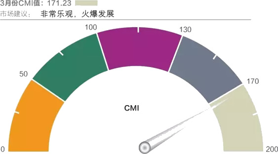2017年3月份中國(guó)工程機(jī)械市場(chǎng)指數(shù)即CMI為171.23,同比增長(zhǎng)25.66%,環(huán)比增加57.66%。2017年3月份中國(guó)工程機(jī)械市場(chǎng)指數(shù)比上月提高62.62點(diǎn),比上年同期提高34.97點(diǎn),同比、環(huán)比繼續(xù)增長(zhǎng),而且也創(chuàng)下了2011年7月CMI指數(shù)創(chuàng)立以來(lái)的高值。