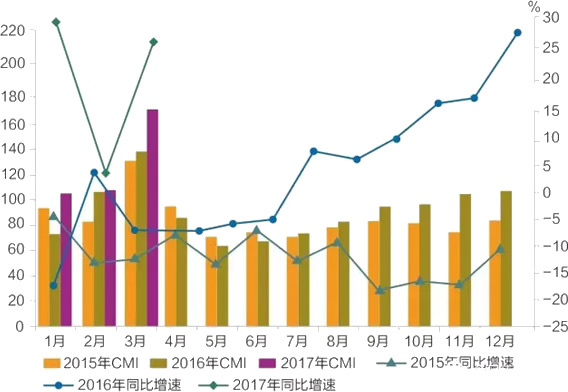 2015年-2017年CMI指數(shù)及同比增速變化趨勢(shì)