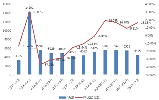 工程機(jī)械行業(yè)的回暖帶動裝載機(jī)銷量大增,前瞻產(chǎn)業(yè)研究院發(fā)布的《中國裝載機(jī)行業(yè)產(chǎn)銷需求與投資預(yù)測分析報告》統(tǒng)計顯示,2017年1月份國內(nèi)25家主要裝載機(jī)生產(chǎn)企業(yè)合計銷售各類裝載機(jī)共計4495臺,同比大增16.33%。